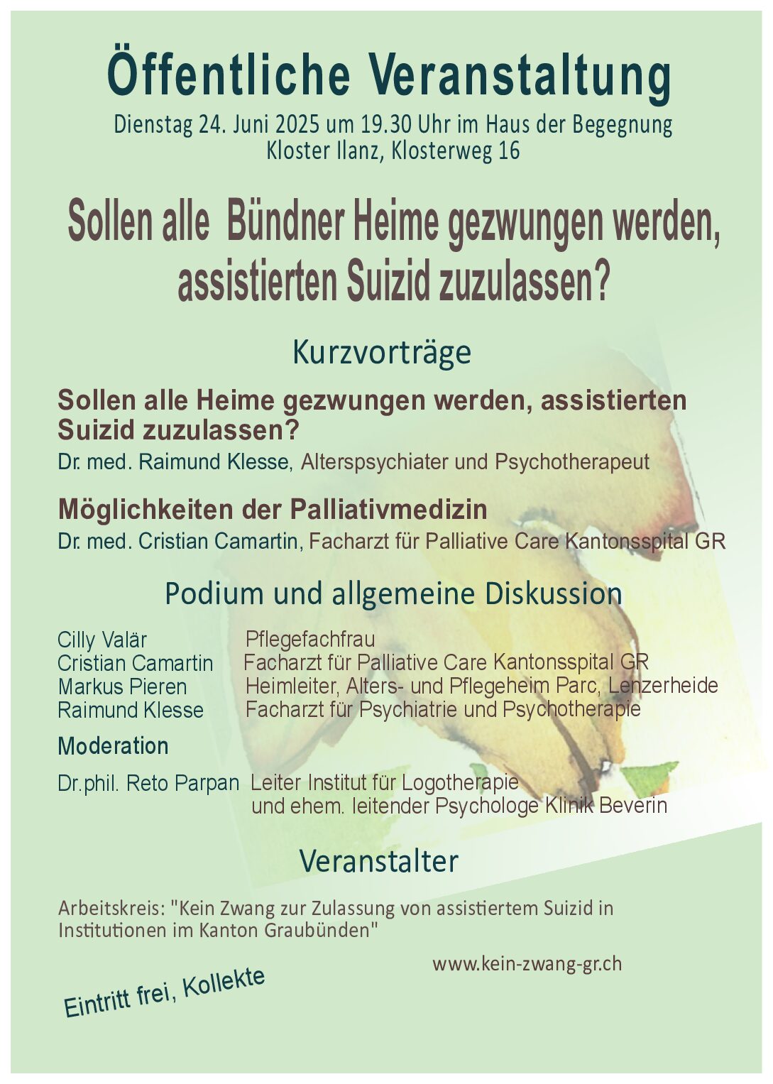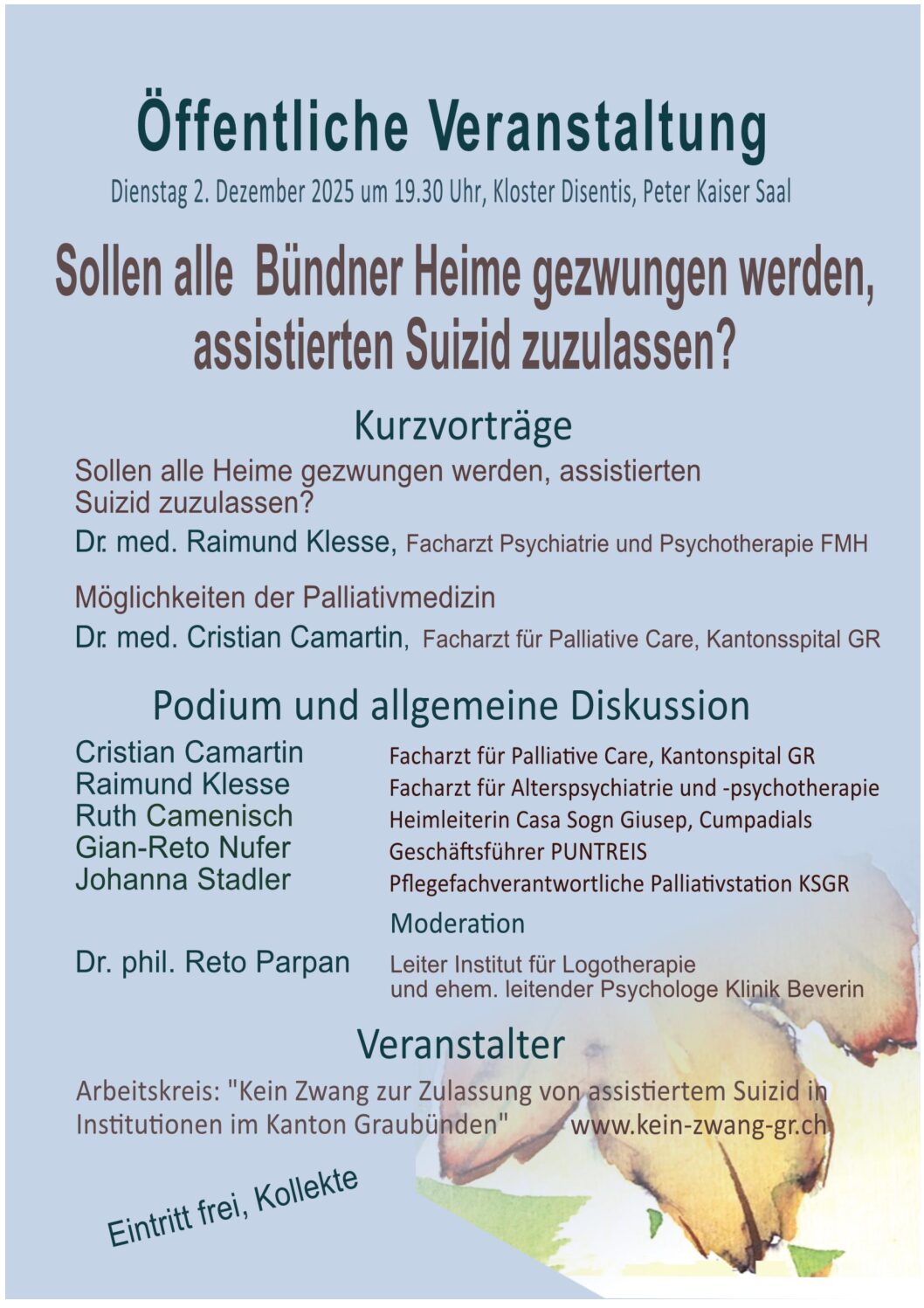 Am Dienstagabend hat der Arbeitskreis «Kein Zwang zur Zulassung von assistiertem Suizid in Institutionen im Kanton Graubünden» eine öffentliche Veranstaltung im Saal Peter Kaiser im Kloster Disentis organisiert. Zwei Referenten und drei weitere Personen haben an einer Podiumsdiskussion teilgenommen. Der Grund: Im Februar 2021 hat der Grosse Rat den Auftrag akzeptiert, einen Artikel im Gesundheitsgesetz zu formulieren, sodass alle durch öffentliche Mittel finanzierten Institutionen assistierte Suizide in ihren Räumlichkeiten akzeptieren müssten. So soll die Wahlfreiheit genommen werden, die betroffenen Institutionen könnten nicht mehr selbst darüber entscheiden.