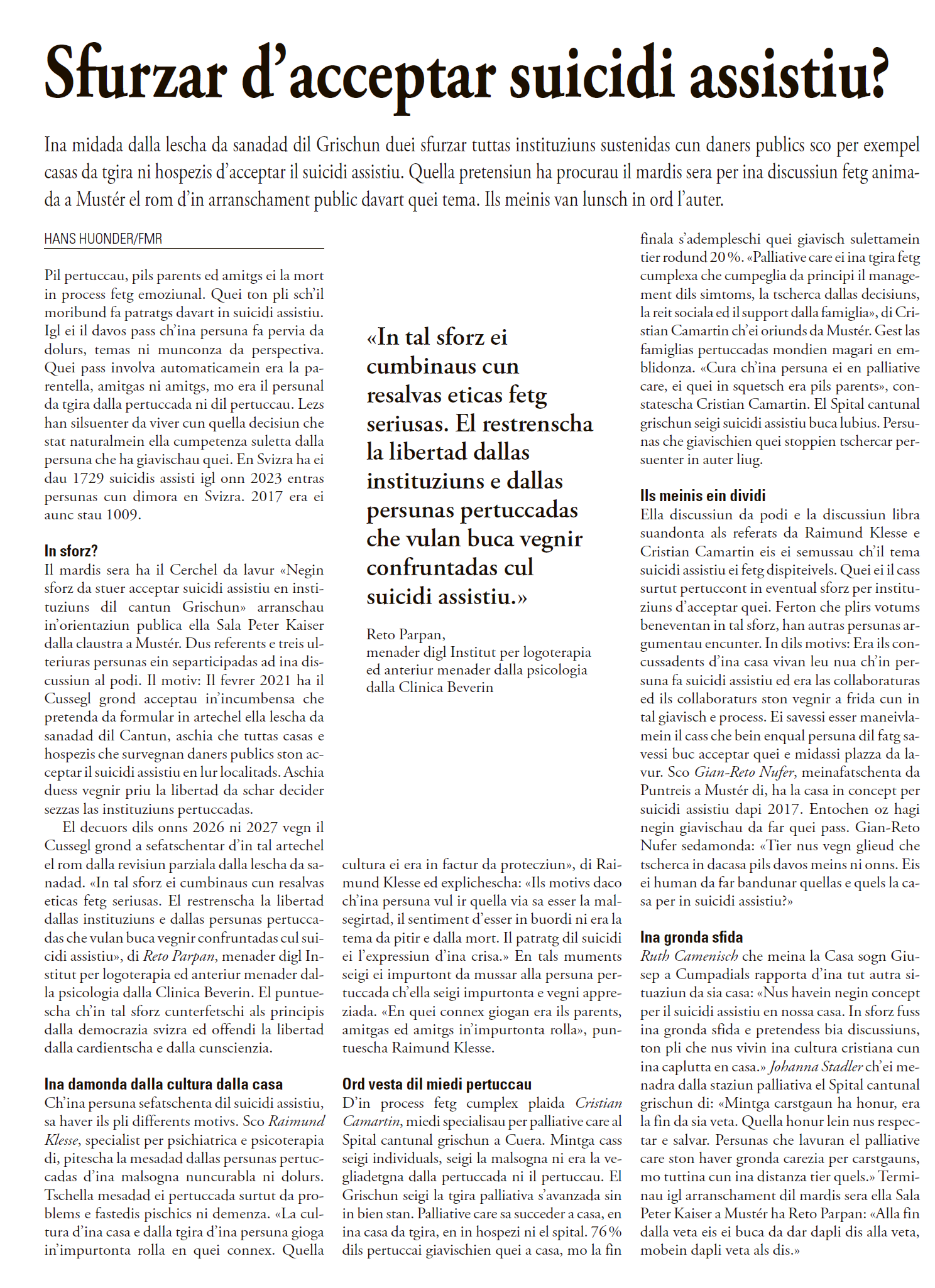 In den Jahren 2026 oder 2027 wird der Grosse Rat sich mit einem solchen Artikel im Rahmen der Teilrevision des Gesundheitsgesetzes beschäftigen. «Ein solcher Zwang ist mit sehr schwerwiegenden moralischen Vorbehalten verbunden. Dieser Artikel schränkt die Wahlfreiheit der Institutionen und der betroffenen Personen ein, welche nicht mit assistiertem Suizid konfrontiert werden wollen» sagt Reto Parpan, Leiter des Instituts für Logotherapie und Existenzanalyse und ehemaliger leitender Psychologe der Klink Beverin. Er betont, dass ein solcher Zwang in Widerspruch zu den schweizerischen demokratischen Prinzipien steht und die Glaubens- und Gewissensfreiheit beschränkt.