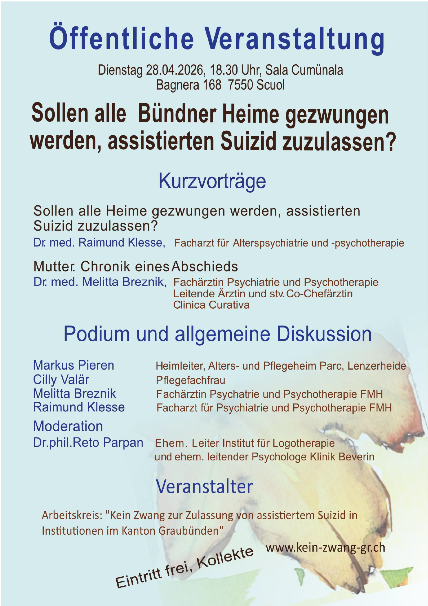 Ruth Camenisch die Leiterin Casa sogn Giusep in Cumpadials berichtet von einer ganz anderen Situation in Ihrem Heim. «Wir haben kein Konzept für assistierten Suizid in unserem Heim. Ein Zwang wäre eine grosse Herausforderung und verlangte nach vielen Diskussionen, umso mehr da wir in einer christlichen Kultur leben mit einer Kapelle im Haus.» Johanna Stadler, die Fachleiterin der Palliativstation im Kantonsspital Graubünden sagt: «Jeder Mensch hat Würde, auch am Ende seines Lebens. Diese Würde wollen wir respektieren und bewahren. Personen, die in der Palliative Care arbeiten, müssen grosse Menschenliebe haben, trotzdem einen gewissen Abstand wahren». Die Veranstaltung in der Sala Peter Kaiser in Disentis hat Reto Parpan beendet: «Am Ende des Lebens ist es nicht wichtig, dem Leben mehr Tage zu geben, sondern den Tagen mehr Leben.»